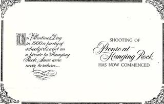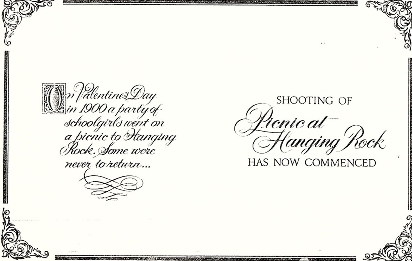 Printed card announcing that shooting of 'Picnic at Hanging Rock' has commenced.