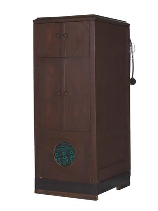 Sid’s TV features a small green screen and easily accessible slide-out component trays, all housed in a purpose-built wooden cabinet.