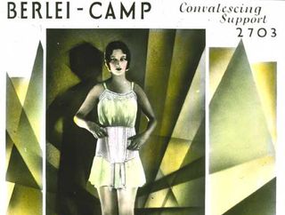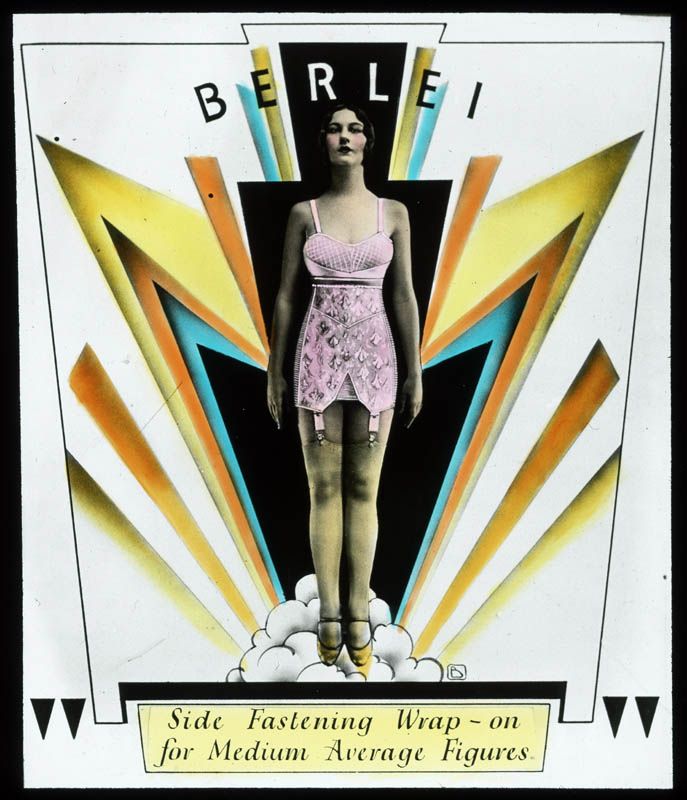 The design of the background has strong art deco references. There is something 'Wonder Woman' about the image with the model standing straight and proud - clouds and angular shapes emanating from her. The character of Wonder Woman didn't appear in DC Comics until 1941, so she is ahead of her time. The glass slide would have been used either as an advertisement in a cinema setting or as part of the educational training package for Berlei fitters.