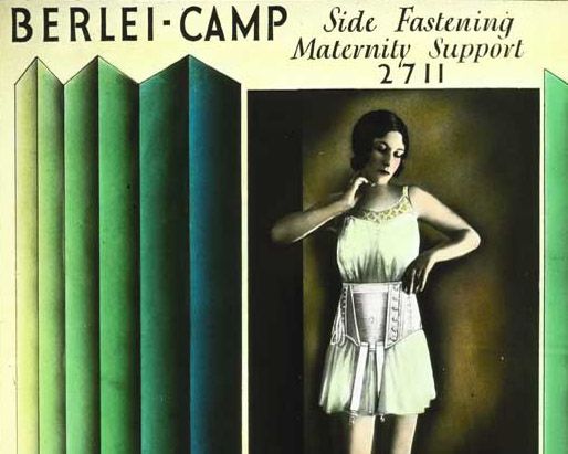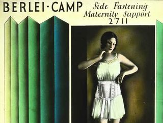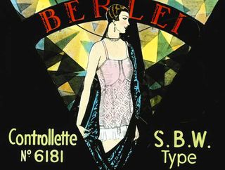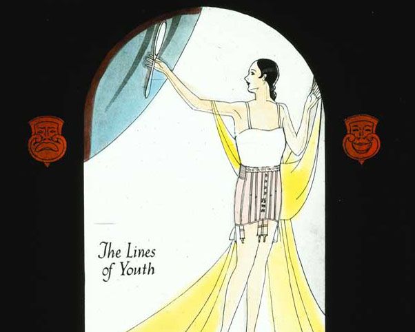 Like all successful advertising this glass slide image sells much more than just the product - Berlei's 'side fastening wrap-on [corset] for medium average figures'. We are being sold the ideas of beauty, strength, virtue, excitement (she's got her feet in the clouds!) and design, and how all of these ideals come together in the Berlei brand.