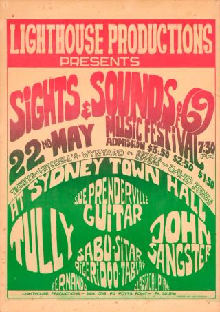 Poster for the Sights & Sounds of 69 Music Festival, held at the Sydney Town Hall in May 1969. Val Hogdson was the poster artist.