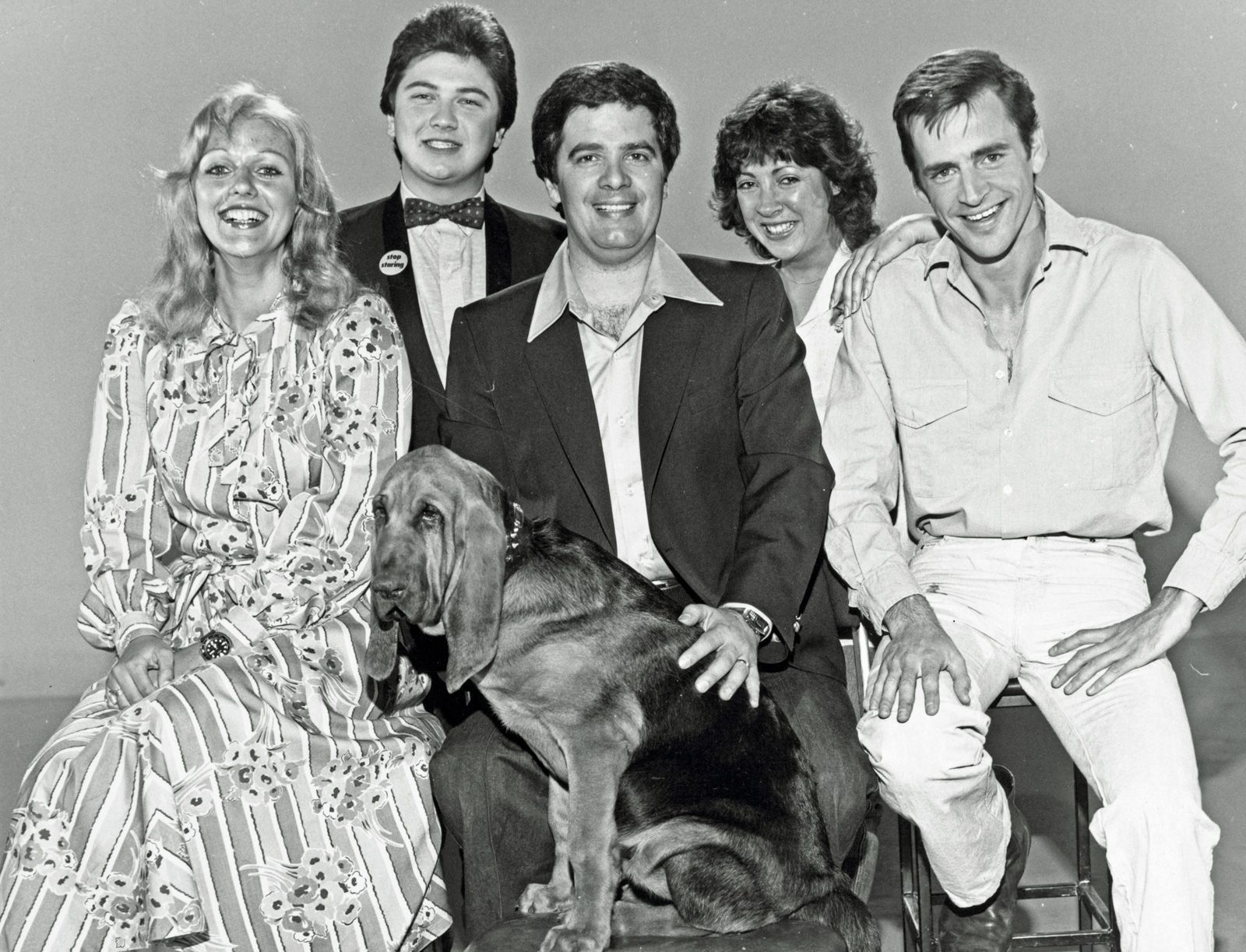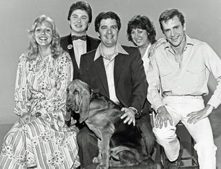 A publicity still for Simon Townsend's Wonder World! from the show's first season featuring the original four reporters with host Simon Townsend and mascot Woodrow.