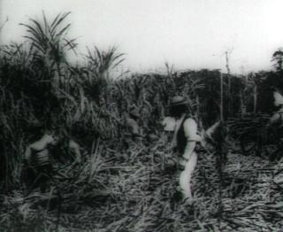 Frame capture from the 27 seconds of a nitrate film showing South Sea Islander labourers cutting sugar cane at Nambour, Queensland, under the watchful eye of an overseer. One of the few pieces of footage of Melanesian labourers cutting cane in Queensland. Filmed using a static Lumière Cinematograph.