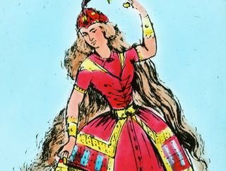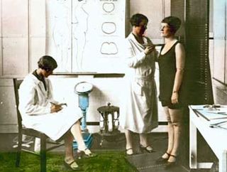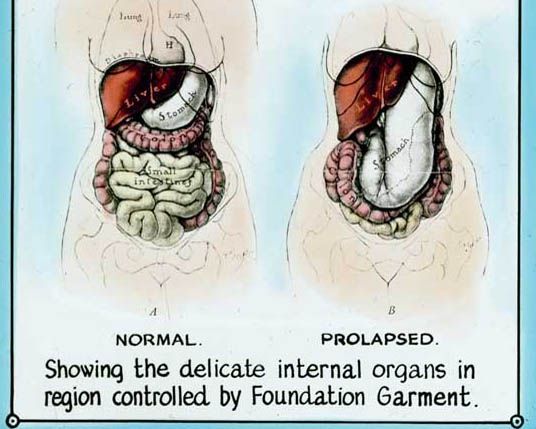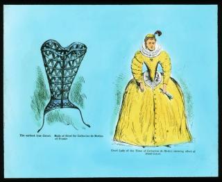 This educational glass slide would have been shown to prospective Berlei fitters. It depicts the 'earliest true corset made of steel for Catharine de Medias (sic) of France and a court Lady of the time of Catherine de Medici showing the effect of the steel corset'. Unlike corsets from the Victorian era and beyond which tended to create an hourglass figure, the fashion of the 1500s was for a funnel-like shape. It's now believed that Catherine de Medici (1519–1589), Queen of France, did not start the craze for fashion metal corsets. Rather, they were designed for orthopaedic support and correcting 'crookedness of the Bodie' (as French army surgeon Ambroise Paré called it).
