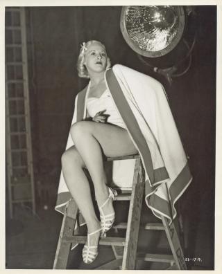 DAD AND DAVE COME TO TOWN : JEAN MEDARAS (CINESOUND GIRL); SITTING ON A STEP LADDER POSING. SHE'S WEARING A BATHING SUIT AND CLOAK; FROM FASHION PARADE SCENE