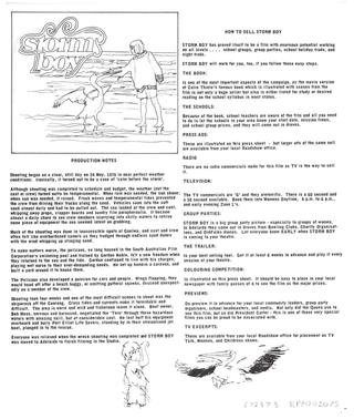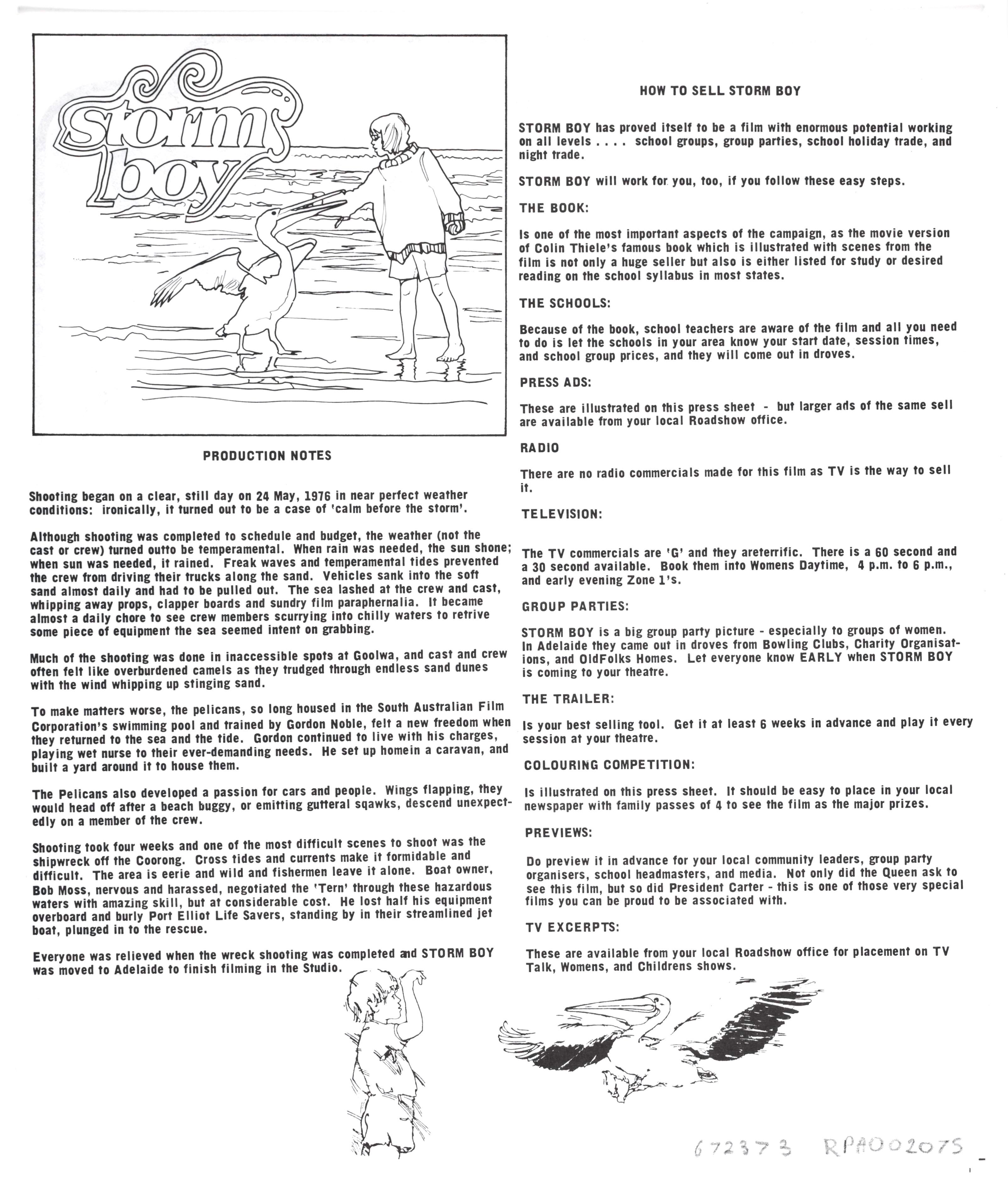 Page two of a Roadshow Distributors press sheet created for Storm Boy, featuring production notes, how to sell Storm Boy and details of ads to place, preview screening instructions and a colouring competition for local newspapers. This is page two of a two page press sheet.