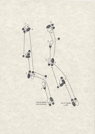An annotated diagram of dance steps, part of the promotional materials for the release of Strictly Ballroom in 1992. It includes the positioning of left and right foot for gentleman and lady dance partners.