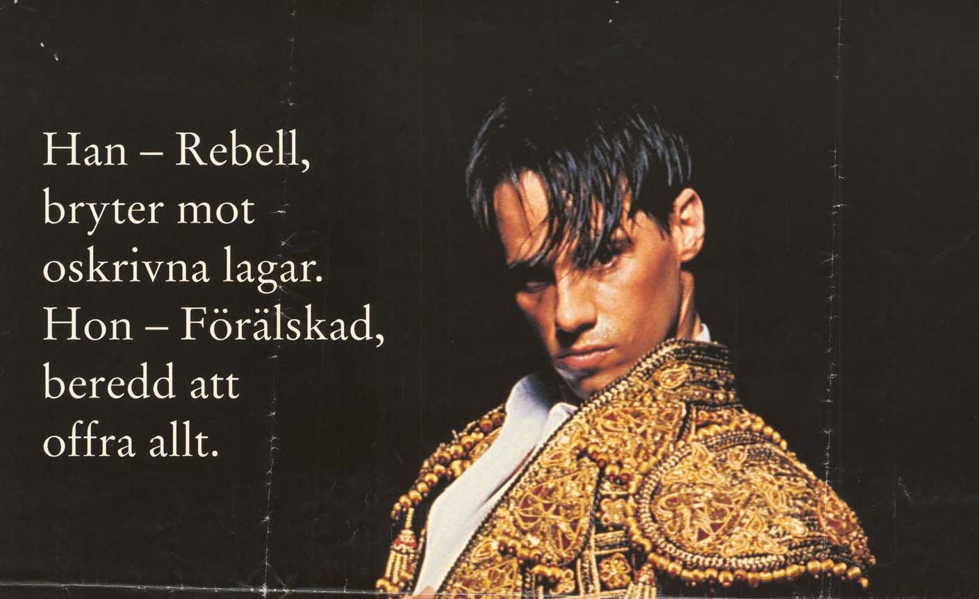 This poster from Sweden seems to defy Strictly Ballroom's overridingcamp and kitsch aesthetic. The stark central image of Paul Mercurio is photographed against a black background and mimics Renaissance chiaroscuro painting techniques. Chiaroscuro uses strong tonal contrasts between light and dark to model three-dimensional forms, often to dramatic effect. It's a beautiful image but a bit incongruous if you've seen the film. The film's title continues this idea with its overly florid font. Anyone could be forgiven for thinking the film is set in the late 15th century. It is only the three frames from the film running down the right-hand side of the poster that informs us the film is set in the present day. The subtitle and taglines on the poster almost recast Strictly Ballroom as a modern take on Romeo and Juliet while suggesting that the film will have some steamy sexual scenes. This could potentially confuse or disappoint audiences who decided to see the film solely on the basis of the poster.