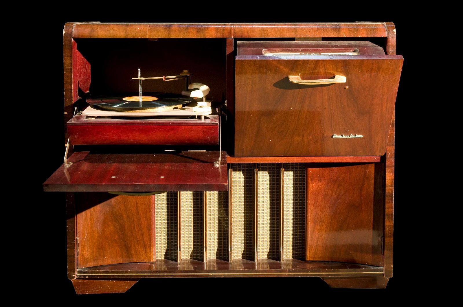 The radiogram has two pull down drawers at the front with a turntable on the left and radio on the right. On either side at the bottom of the radiogram, are curved doors which open outwards and this allows for storage of discs. Operation method: electrical. Manufactured 1950.