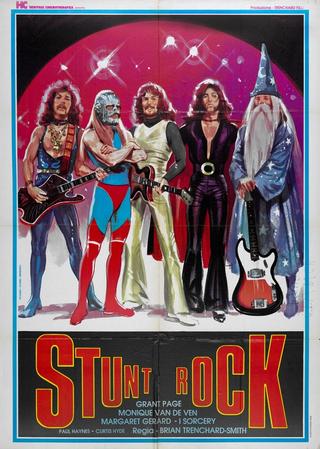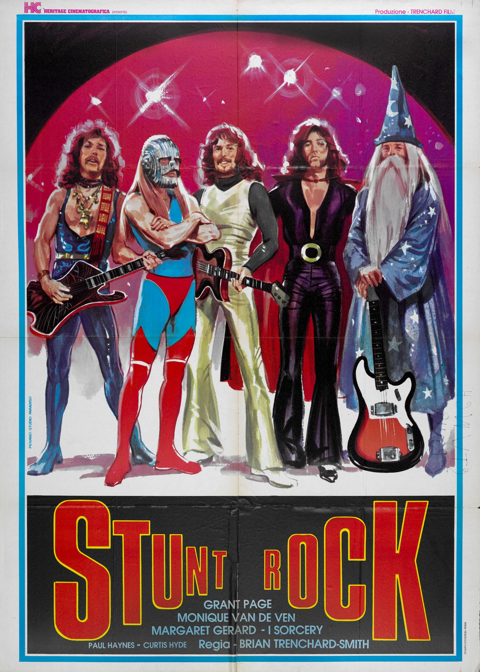 This is an oversize, full-colour Italian poster for Stunt Rock (1979), measuring 1.4 x 1.0 metres. The main image is rock band Sorcery in their onstage costumes.