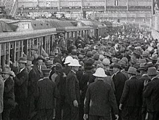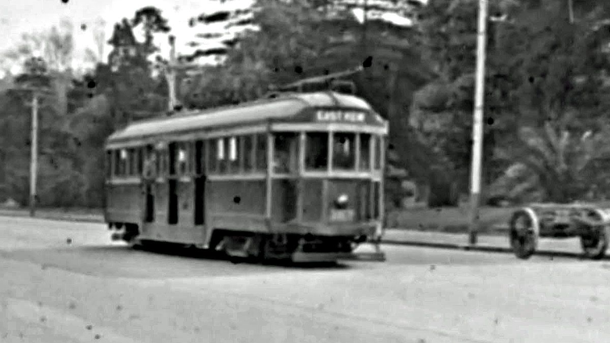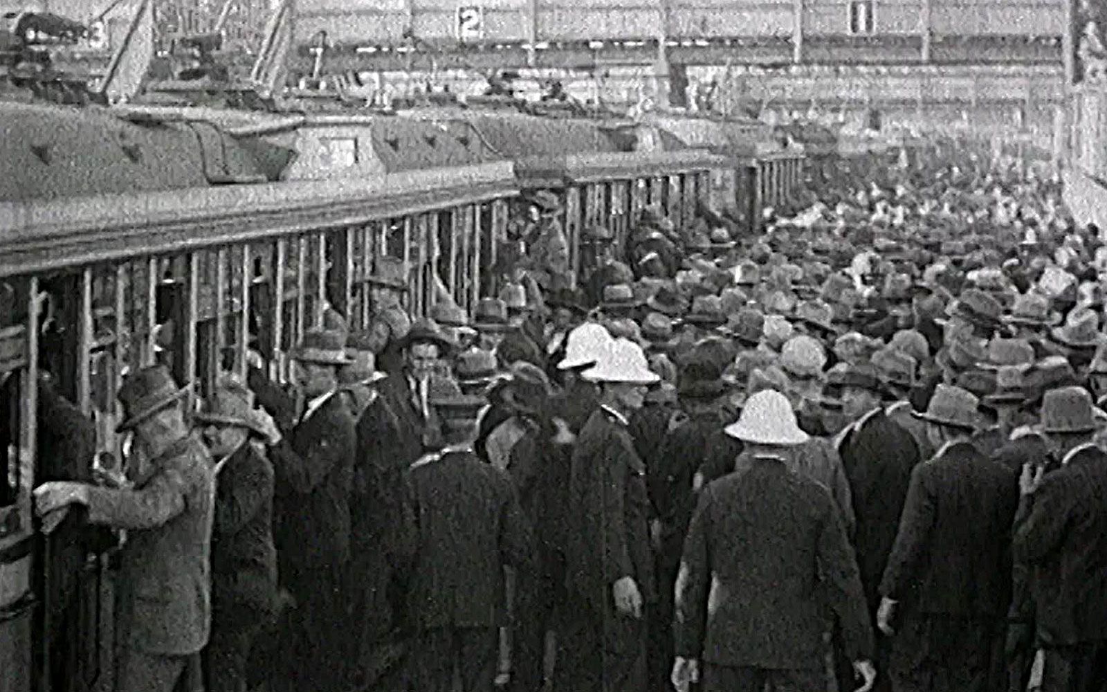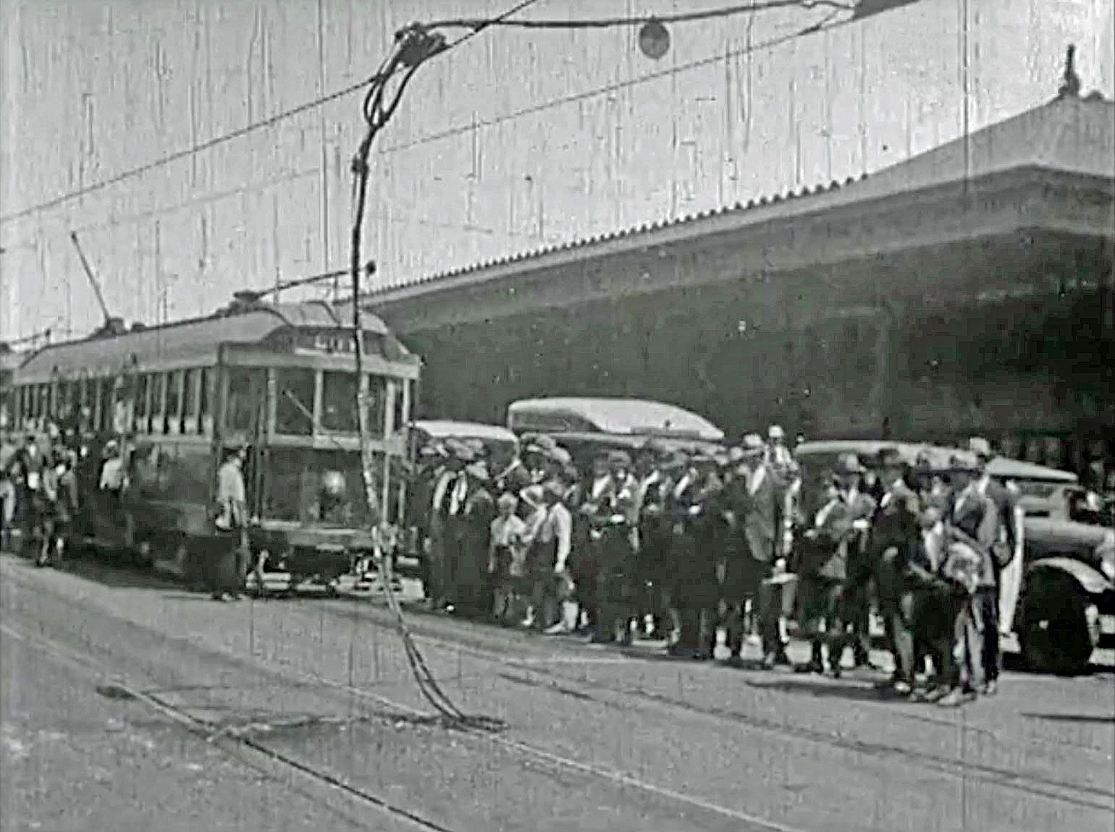 From an elevated position above Central Square (now Railway Square) in Sydney, the camera films the bustle of the streets at rush hour where people transfer from trams to trains and suburban trams to take them out of the city.