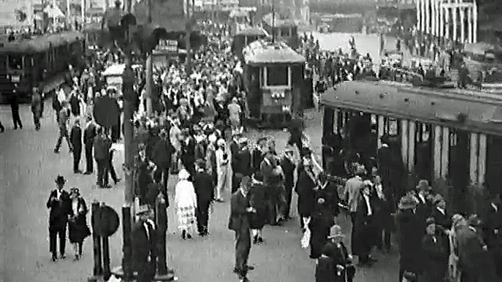 This clip shows an extraordinarily large crowd leaving the Randwick Racecourse and miraculously piling into dozens of waiting trams without a single person being crushed.