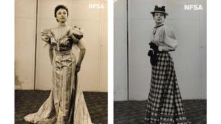 Left: Joan Lord as Lady Sims wearing Thelma Afford’s costume design for The Twelve Pound Look, the television play broadcast on the ABC’s first night of television in November 1956. NFSA title: 460838.