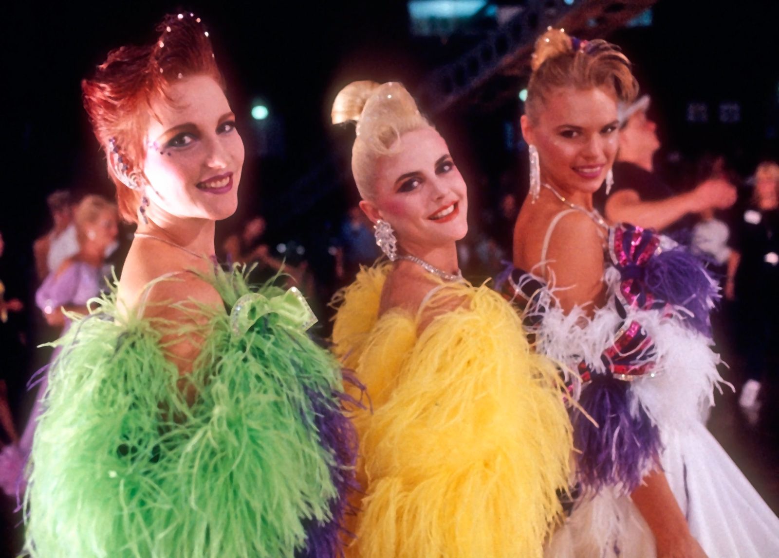 Scene from Strictly Ballroom featuring Vanessa (Leonie Page), Liz (Gia Carides) and Tina (Sonia Kruger).