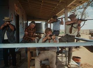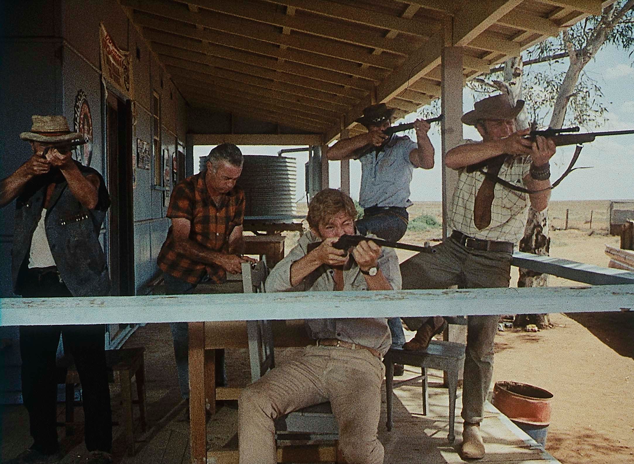 An image from Wake in Fright featuring four men aiming rifles: (left-right) Donald Pleasence as Doc Tydon, Gary Bond as John Grant, Peter Whittle as Joe and Jack Thompson as Dick.