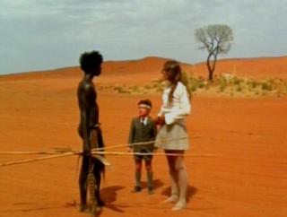 After a setback in Sydney, a man drives into the outback with his two English children, a girl of 16 (Jenny Agutter) and her younger brother (Lucien John). The father (John Meillon) tries to shoot them; when he fails, he sets the car on fire and shoots himself. The young woman and her brother begin to walk, unsure of where to go. Without much food and water, they are soon in desperate trouble, unable to read the landscape or find help. A stranger appears – a young Aboriginal hunter (David Gulpilil). He shows them how to find water and shares his food – a succession of lizards, kangaroo meat and birds. The boy and the young black man bond instantly, though neither can speak the other’s language. The young woman is more cautious, both fascinated and repelled by the man’s nudity and his graceful body.