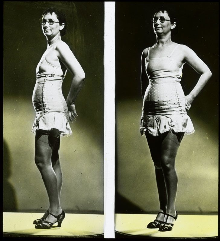In the collection there is both a black-and-white and a yellow tinted version of this slide. Perhaps the two different coloured slides were used in sequence to make a point about different body shapes, 'figure flaws', incorrect postures or ill-fitting corsetry.