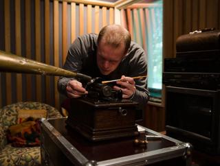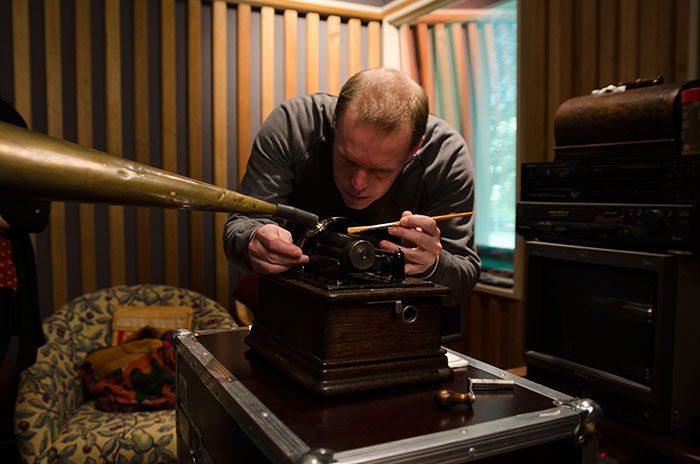Ian Gilmour operating wire sound recording equipment at his desk in the Music and Sound Recording section of the Commonwealth National Library c1980. NFSA title: 565994.