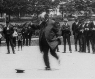 Patineur Grotesque (or The Burlesque Rollerskater) lasts for just one minute. A bearded man in street clothes, smoking an outsize cigar, is rollerskating in a park, watched by a crowd. He loses his hat and tumbles over clownishly when he tries to retrieve it. Jamming it back on his head, he gains his feet and moons his audience with a series of bows that reveal a white hand printed on his trousers, as if it’s gripping his buttocks. His finale is a dizzying series of spins – over 20 in a row – that show him to be an athletic performer dressed as a staid middle-aged man.