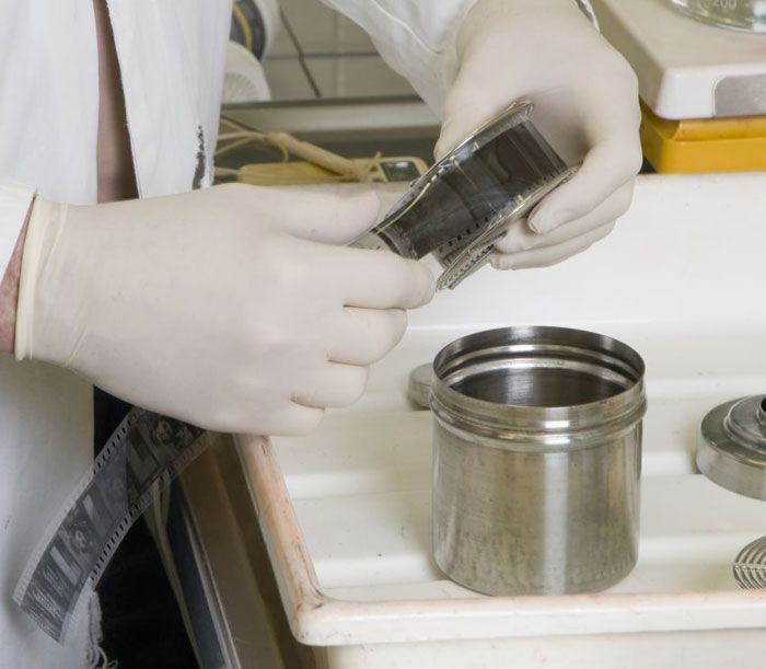 Having established the formula, a one litre solution of dye was prepared for tinting the title. At three feet (one metre) long, hand dipping the film was impractical and could have led to an uneven take-up of the dye. Instead, the film was wound onto a photographic frame called a spiral (used in still photography to allow solutions to flow evenly around film). To ensure the dye nearest the film did not become exhausted, which would have resulted in patchy colour, the spiral was agitated through the dye solution (moved up and down by hand).