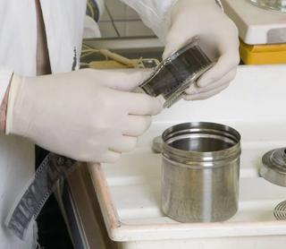 If the NFSA was to move up to tinting full-length films, machine processing would have to be used. Continuous processing machines provide the most efficient way of handling long lengths of film. The Motion Picture Lab has a spare film processing machine (left over after a machinery upgrade in the 1990s) and we were able to modify this processor for the project. Our earlier tests showed that powdered aniline dye solutions worked best when kept at a temperature of around 20°C and machine processing would allow us to control the temperature and agitation of the dye solution.