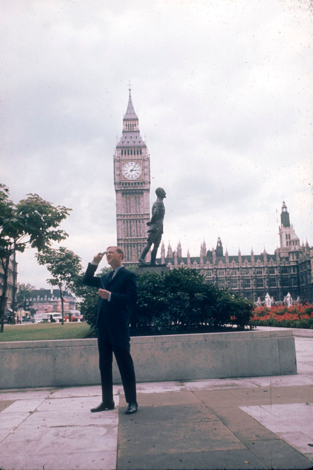 Graham Kennedy taking photos in Parliament Square, London. Big Ben, Westminster Hall and the statue of Field Marshal Jan Christiaan Smuts in the background, 1961. Courtesy Gabrielle Beams.