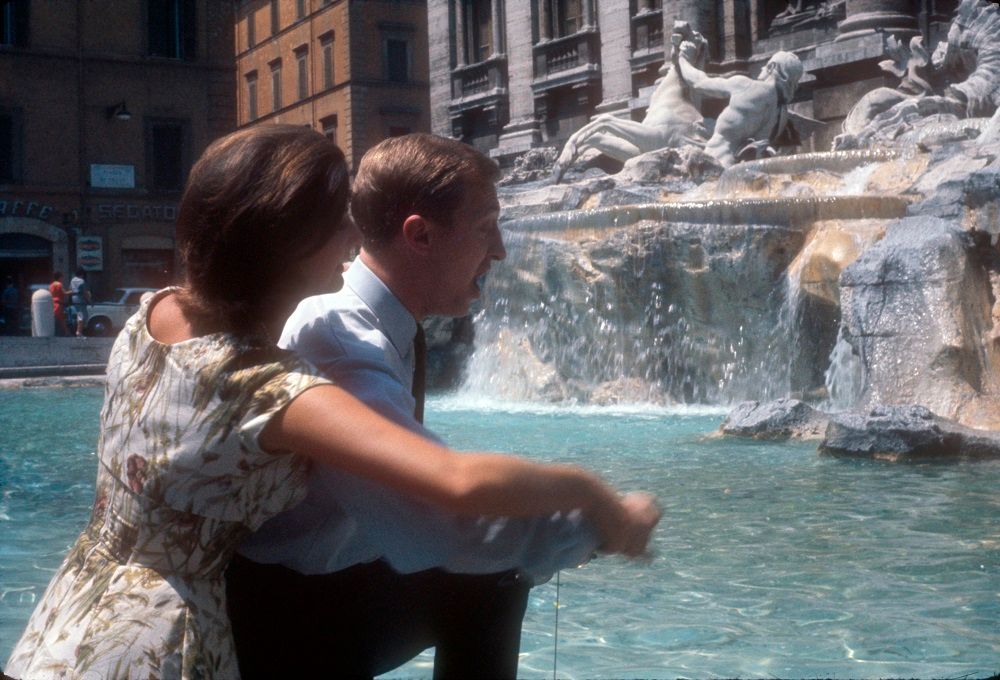 Graham Kennedy and Silvana Alliotti toss coins in the Trevi Fountain, Rome, Italy