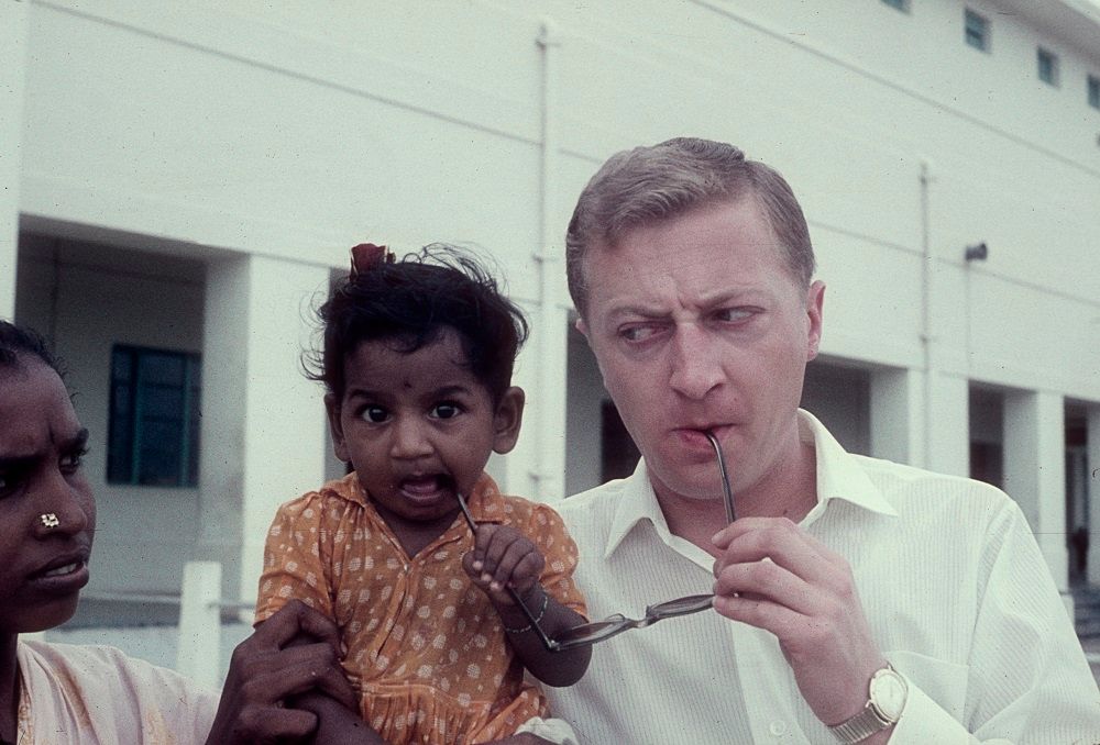 Graham Kennedy clowns with a child in Bombay (Mumbai), India, 1961.Courtesy Gabrielle Beams.