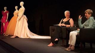 Lynda House (right) interviewed by Meg Labrum on stage at the NFSA with three costumes from the film visible at left.