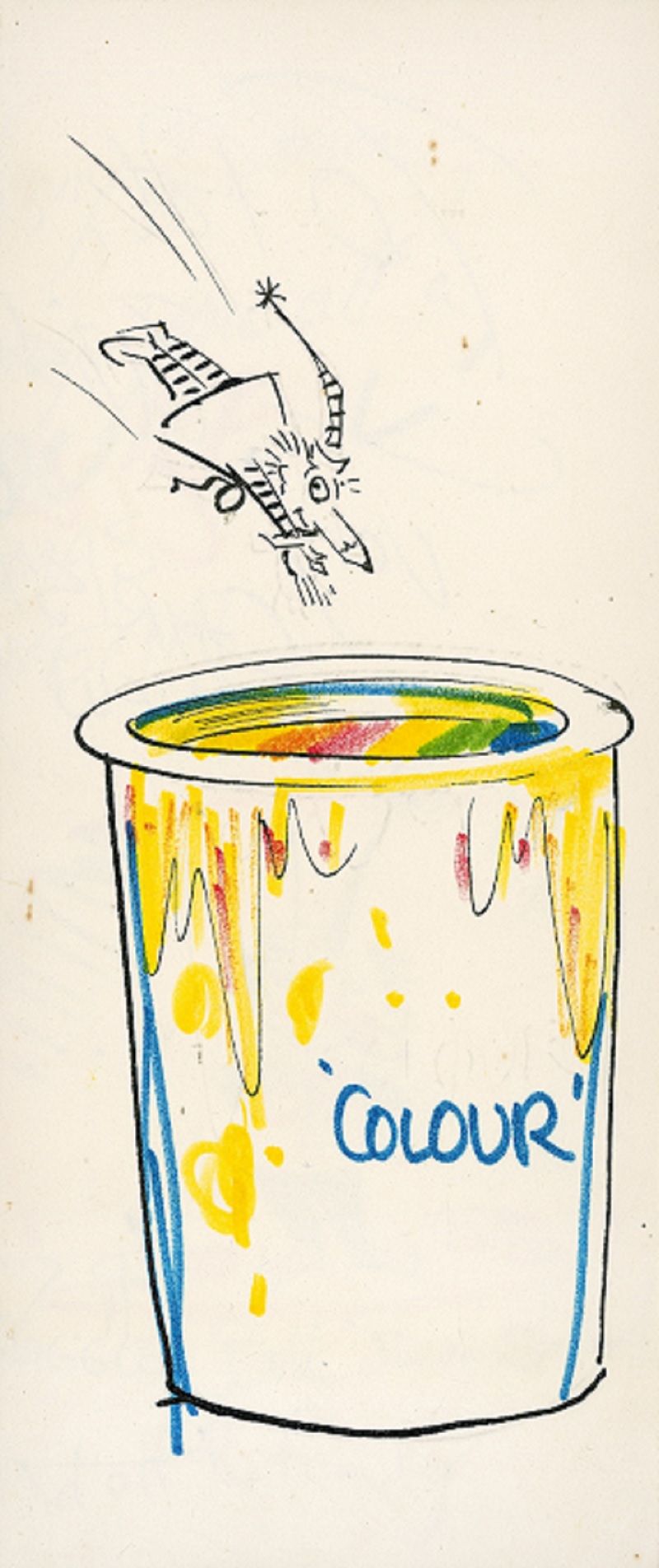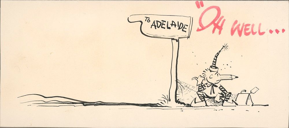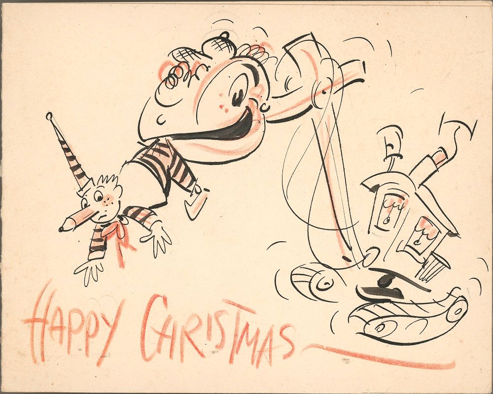 Norman’s 1975 Christmas card celebrates the introduction of colour television, with a black-and-white Mr Squiggle diving into a pot of colour. Another card from 1975 depicts an alarm clock ringing at 4:15 am and the Mr Squiggle characters in bed while Miss Pat runs out the door. This card marks the end of Pat Lovell’s time on Mr Squiggle and her transition to presenter on ATN-7’s early morning Sydney Today show. The card is signed by members of the cast and crew and includes Mr Squiggle’s signature line ‘You have been such a help, Miss Pat’.