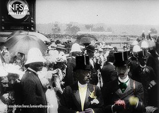 Immediately recognisable on the Lawn near the bandstand are high profile theatrical stars Brough Company leading man George Titheradge in top hat, with company director and leading lady Elizabeth Brough. Will they be watching themselves on the screen at the Cinématographe Lumière soon?