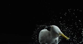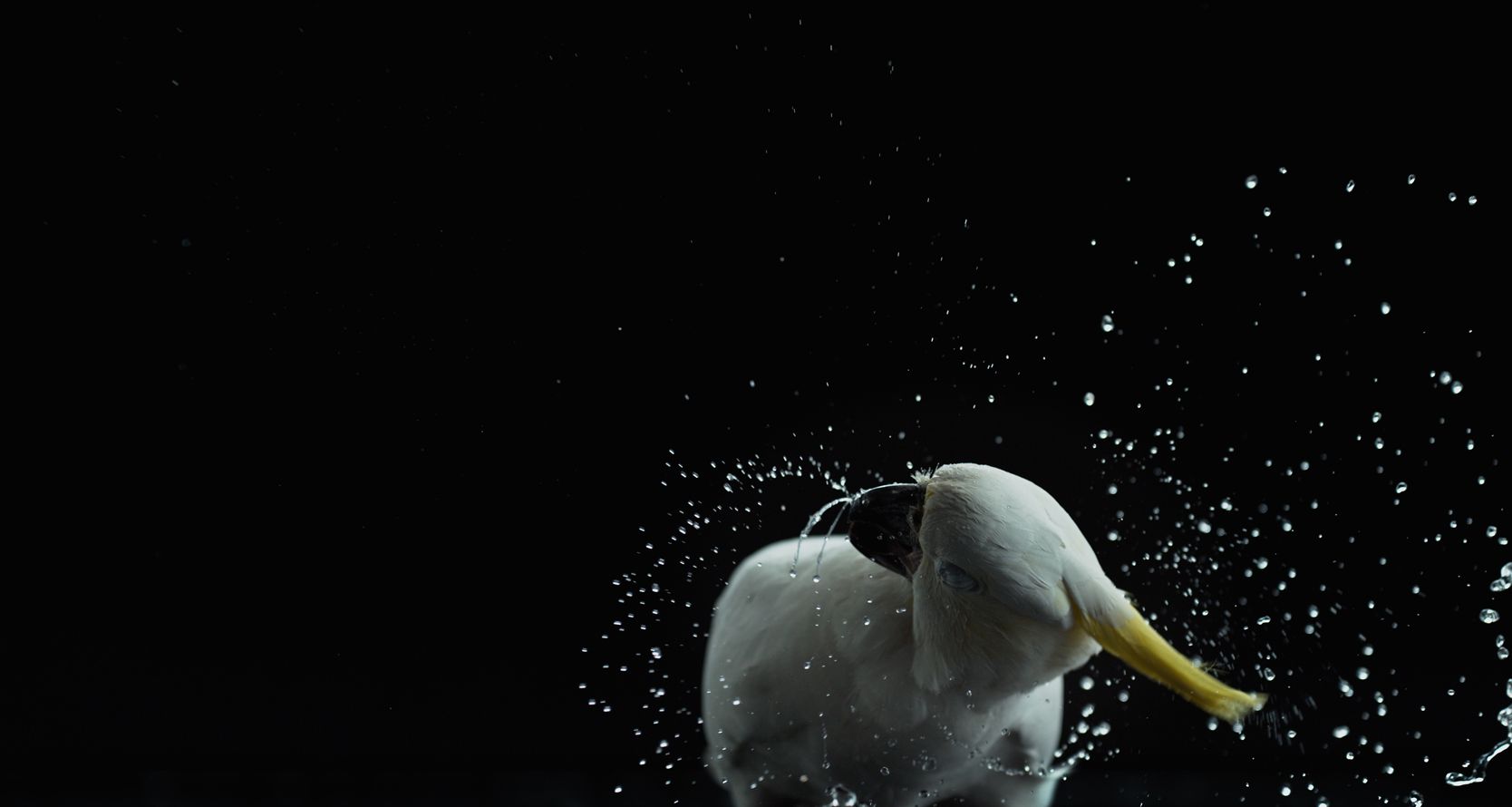 Cockatoos fly in hypnotic loops, appearing and disappearing out of the frame in a reminder of seasons and cycles. They bathe and flap their wings, sending droplets into the space around them, dreamily falling and colliding in slow motion. Below each panel, a shallow pool of still water extrudes outwards toward the viewer, reflecting and refracting the on-screen images.